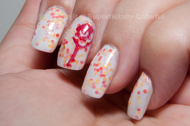 Candy Corn is a lovely milky white base, not quite creme but not completely jelly, with lots of matte yellow and matte red hexes. It applies smooth and easy and the glitter is filling each and every stroke. Two coats are not 100% opaque but being white base makes the nail line almost invisible. It dries quickly and just like any of The Nail Junkie's polishes the glitter is very well suspended in the base and there are no curling or other weird behavior issues. One coat of Seche Vite completes this sweetly beautiful look.