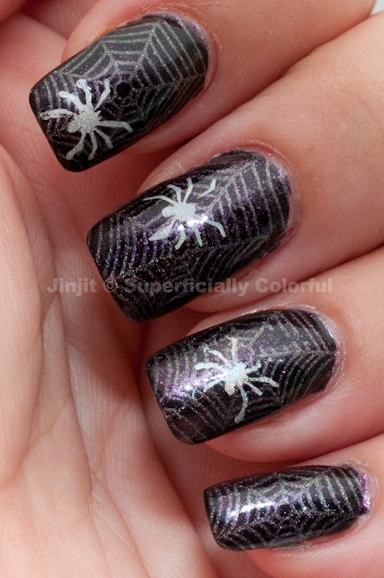 Then I drew my DRK-A plate and A-England Princess Tears polish and stamped the spider web on all nails. Once I was happy (Oh, I was happy!) I used some nail stencils of the little spider along with China Glaze OMG polish. Need I say more?