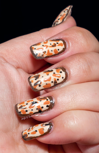 As my base I used a little polish mix I did with Rescue Beauty Lounge - Opaque Nude, Model's Own Lemon Meringue and La-Sera - Tipex, a chalky white creme. For the different levels of burn I used all sort of mixes between these polishes: Julep - Olivia, Sinful Colors - Nirvana, Chic - It's A Date, China Glaze - Love Letters, China Glaze - Mahogany Magic and Zoya Helen. Here and there you can even see a touch of Orly - Liquid Vinyl.