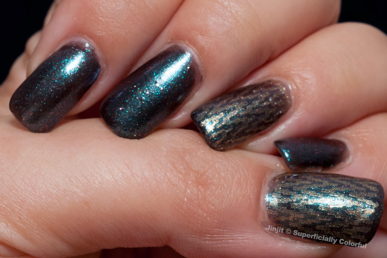 Since my Jugular Vein snake-like mani didn't quite work out in the snake similarity department, I decided again with a different sort of stamping. I wouldn't say it looks much like a snake, but I think I like the way it turned out. I used Konad special polish in Gold and Cheeky Jumbo Plate A. Do you think it looks more like a snake now?